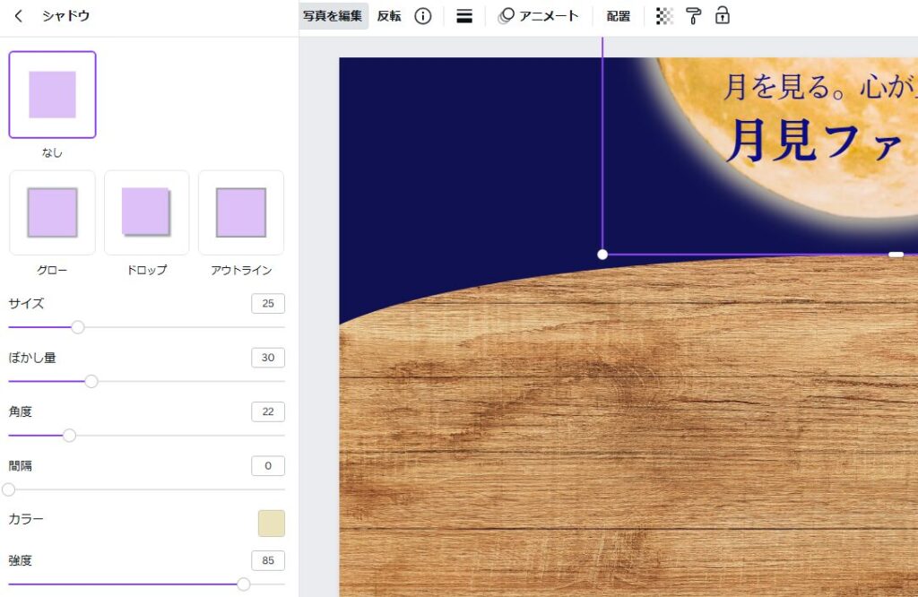 1.影の編集…写真を編集から、影を選択して調整します。サイズや色でかなり印象が違います。今回は、できるだけマックのお月見に近づけましょう。