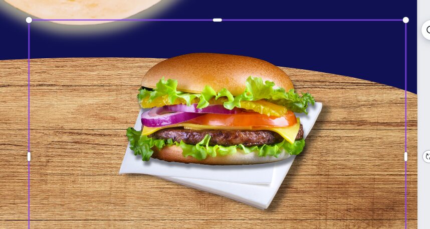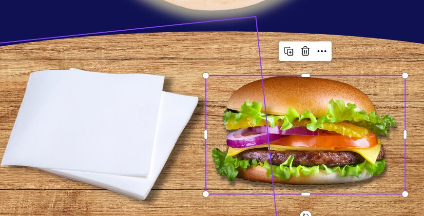 2.画像を配置する。ハンバーガーが全面に、紙ナプキンが背面。ハンバーガーや、パイの画像も検索、挿入する。同じく見本を見ながら、調整する。