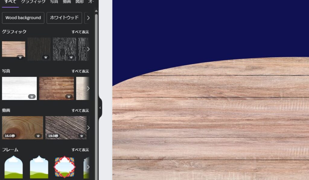 Canvaで作成する場合は「フレーム」を使います。このフレームは、写真を上にドラッグすると自動で調整して、フレームにはいる機能があります。今回は、木目柄を使いたいのでフレームをいれたあとに木目柄をいれていきます。